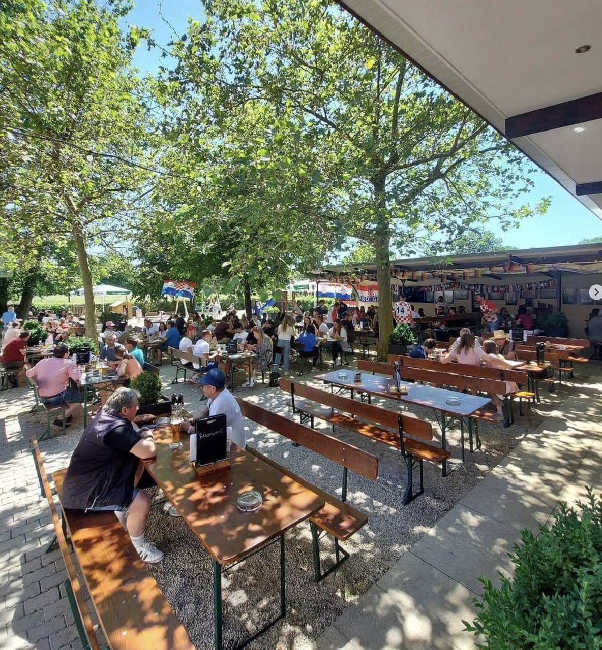 Viel Platz & viel Schatten: Ein großer Außenbereich mit richtig angenehmem „Biergarten-Feeling“ unter Bäumen.